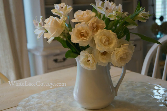 Some flowers I picked up at the market.Love the warm tones of this white!This ironstone pitcher is sitting on top of some shell place mats I recently found and picked up at a thrift store.These are so pretty and a great find!