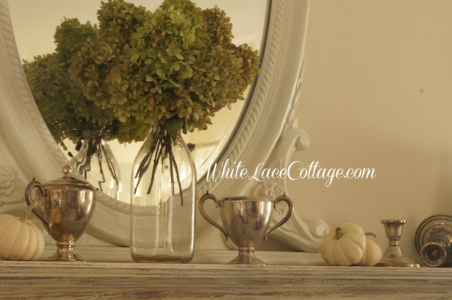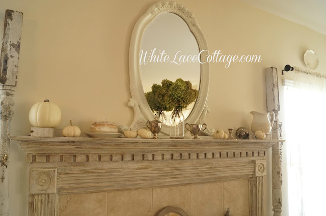 Oh how I love white pumpkins with vintage silver. Great mantle, Anne.