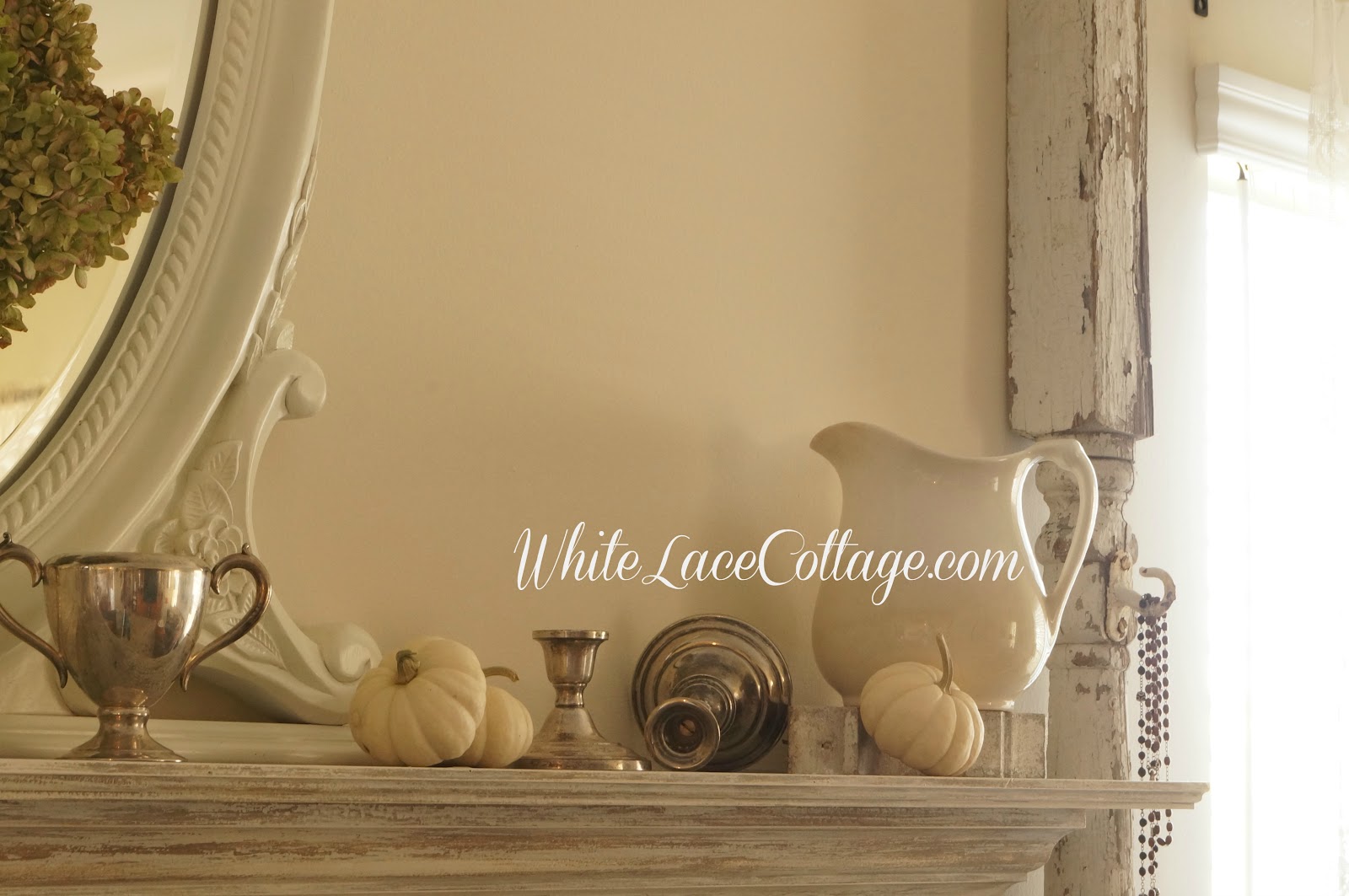 Oh how I love white pumpkins with vintage silver. Great mantle, Anne.