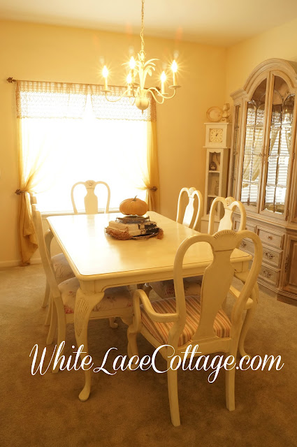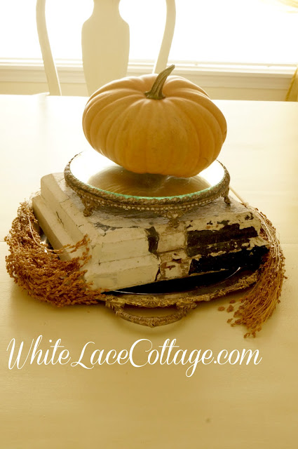 A little vignette in my dining room.A large white pumpkin.I love these! I recently found that sweet little table at a barn sale! I really want to paint it .But it is a antique sewing table.