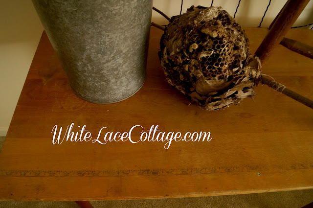 Can you see the measure on the table? I really love that and I don’t think I could paint it! And yes that is a paper nest.I found that at a yard sale today.They had five of these! I bought three and my friend bought one.I am selling one for now.I really hate these on my house.But they are quite beautiful! And fits in with my nature theme.I know Mr. Cottage is going to think I have gone crazy!!!