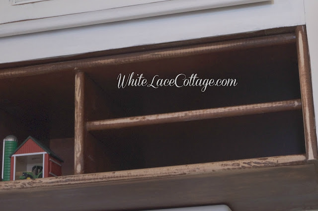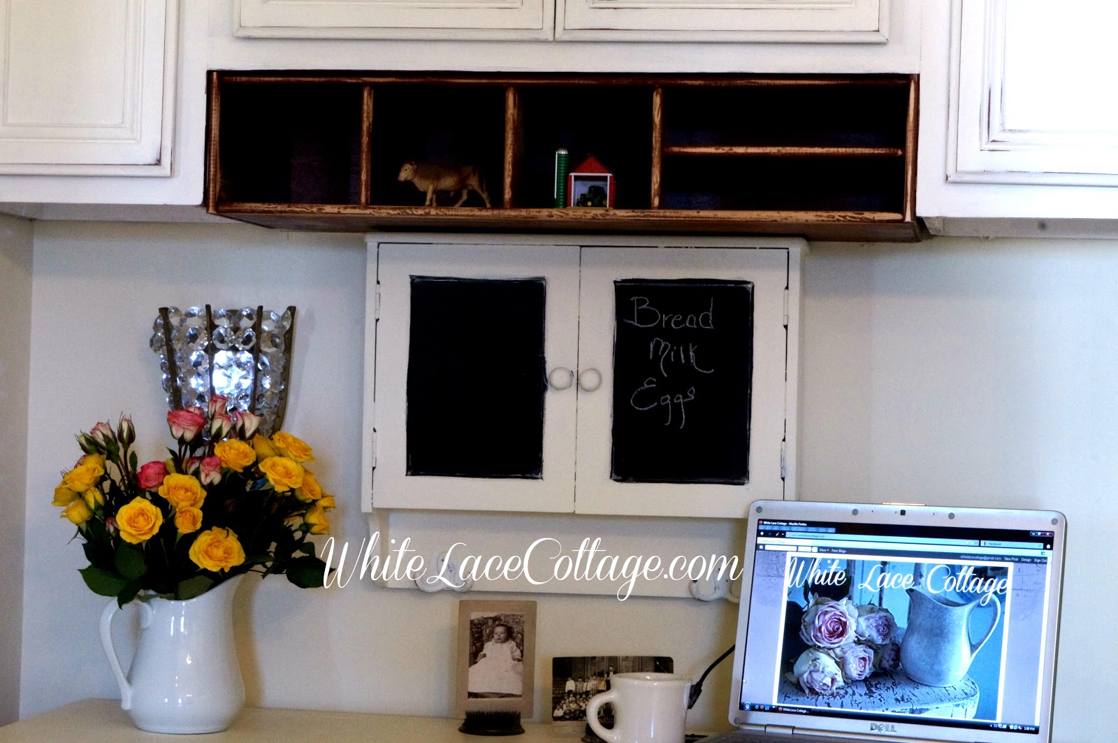 See that cubby below the cabinets?I decided I did not want to paint it.I was stumped on what to do.Then decided to just whether it a bit.I took my palm sander and hit the inside and edges.I really love how this looks like an old piece I added to my cabinets.That chalk board cabinet is hiding my outlet.Yes those brilliant electricians who put that in decided that was a good spot.Not in my book it isn’t!I found this little cabinet and cut a hole in the back.This is what it looks like inside.