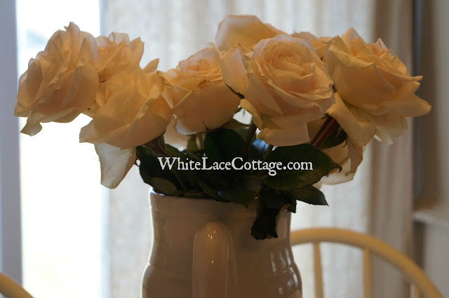 Love those creamy white roses in my French white pitcher.My favorite round board on the table too! I use that every night!