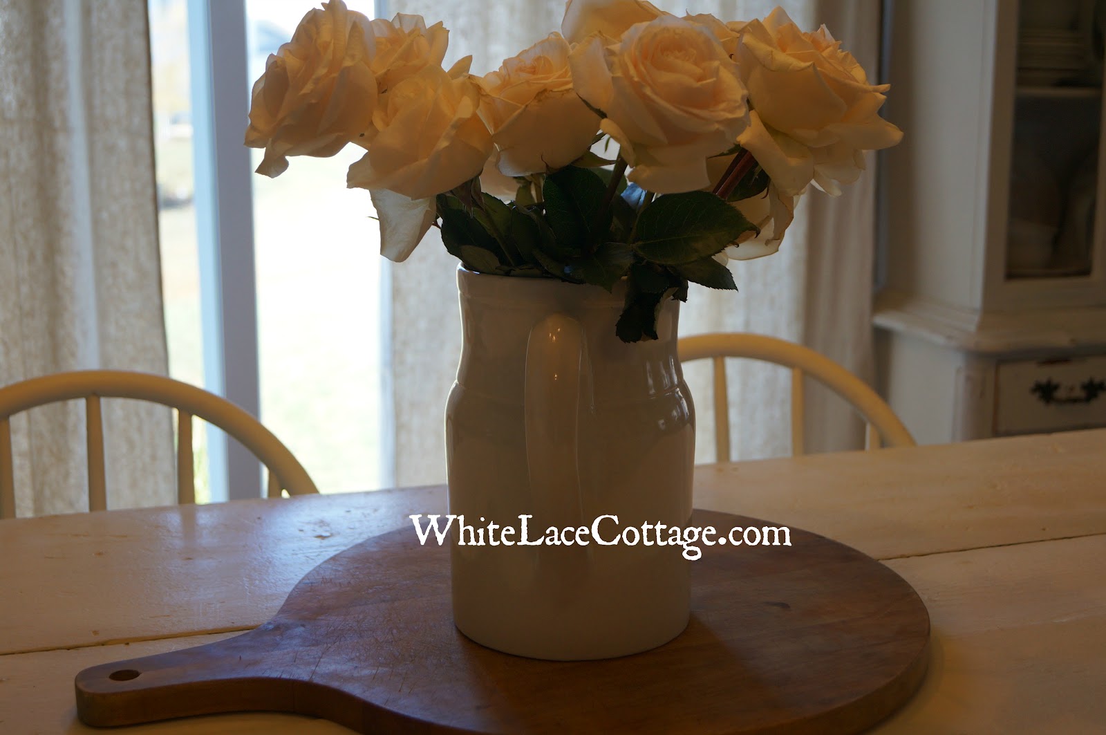 Love those creamy white roses in my French white pitcher.My favorite round board on the table too! I use that every night!