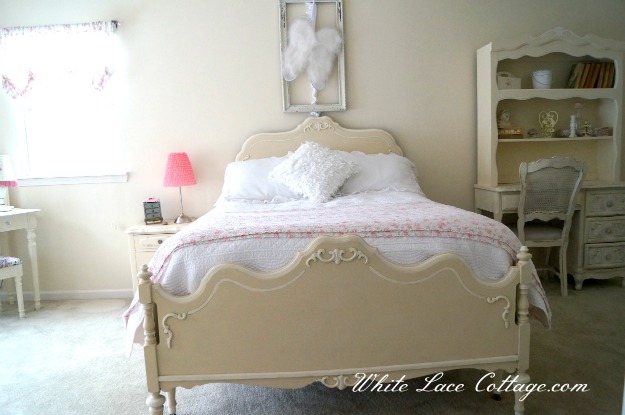 Oh, Anne! It looks fantastic!!!!! What a beautiful, beautiful room! The bed is gorgeous, the dresser is to die for! And I love the angel wings in the frame above the bed! I know your “E” is just loving her new space! (Okay, I’m going a little overboard on the “!” , but really…) I love, love, love the after! Absolutely lovely! 🙂