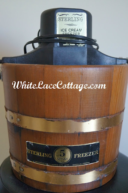 I have been searching for an old wood ice cream machine ever since I spotted one on Becky’s blog Buckets of Burlap .